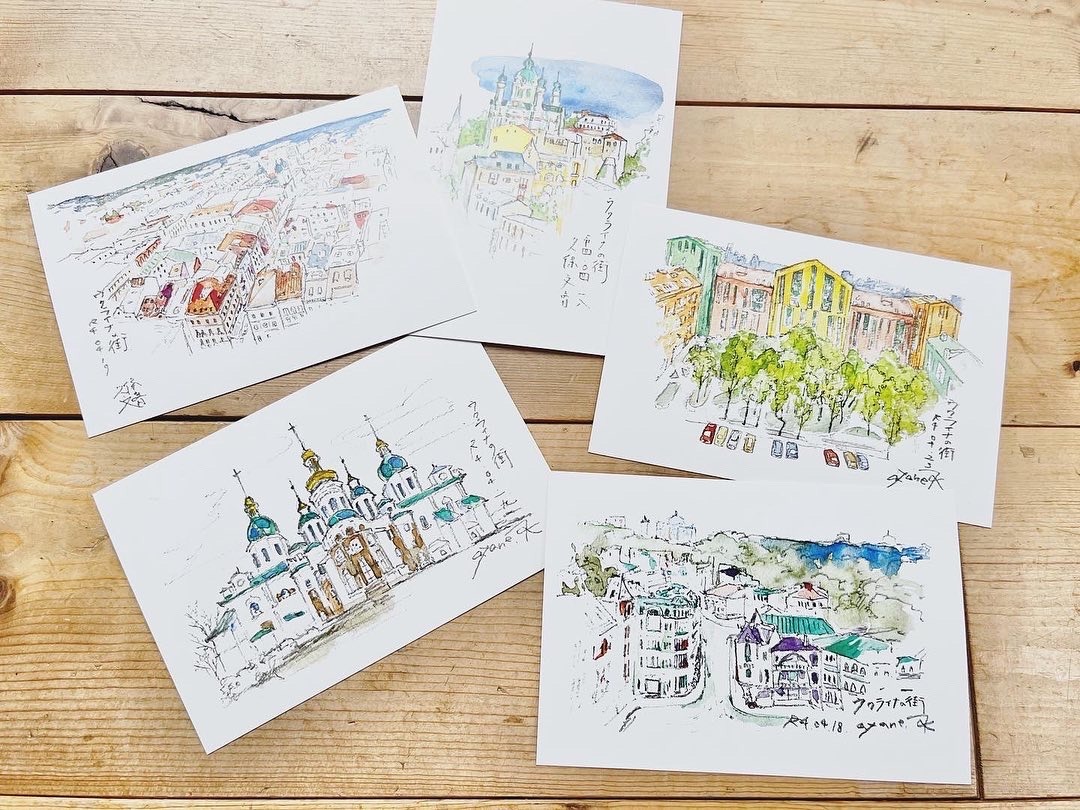 商品は久保文音が水彩で描いたウクライナの街並みスケッチのポストカード5枚入りです。