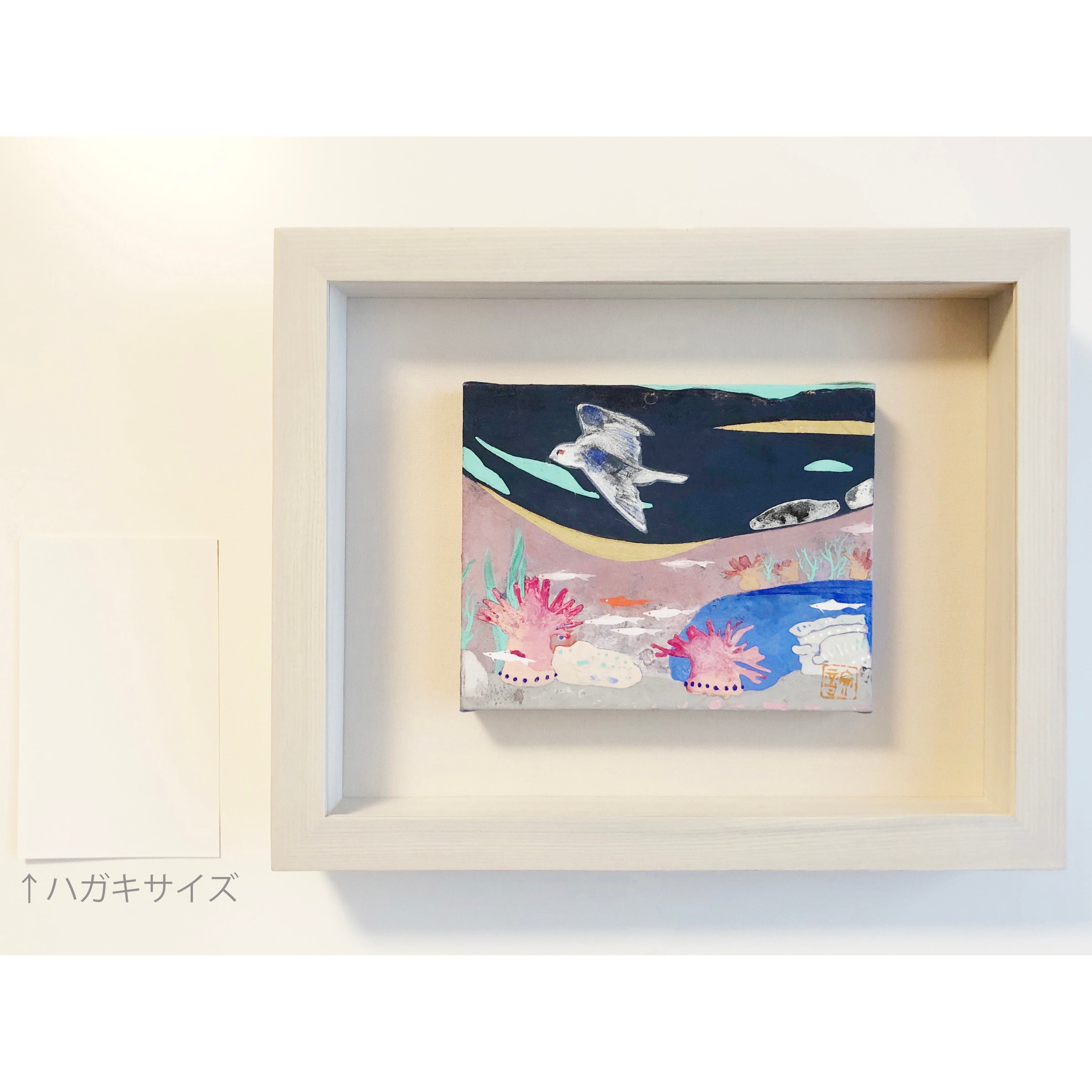 麻紙に岩絵具を用いて描いた絵です。空には鳥や雲、海にはサンゴや魚達のそれぞれの物語が沢山。まるで絵本を見てるかのような、そんな1枚です。白い額に絵が生えて、ホワイトベースのお部屋や木彫のお部屋のアクセントになります。