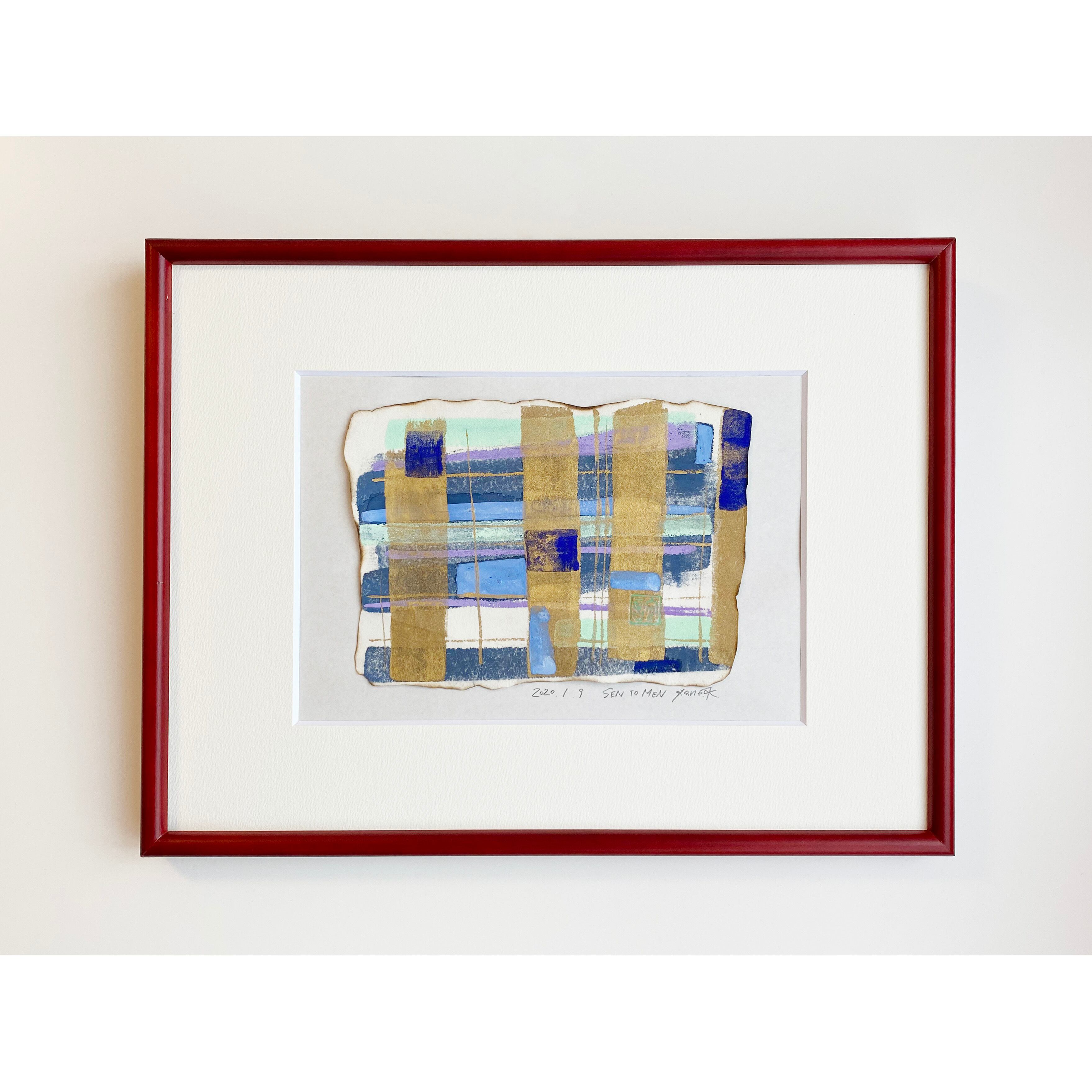 焼いて作った麻紙に、岩絵具はもちろん、ペンや鉛筆で線を重ねたブルーとゴールドのカラーでまとめたモダンテイストのdrawingです。ワインレッドカラーがレトロな印象の木額を合わせています。
